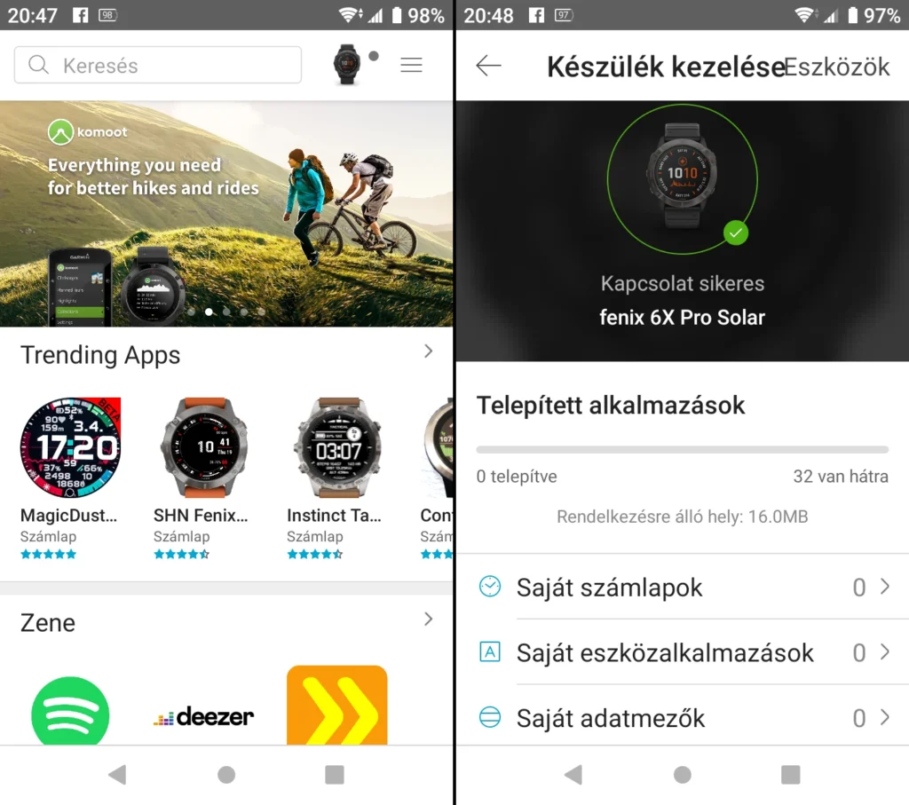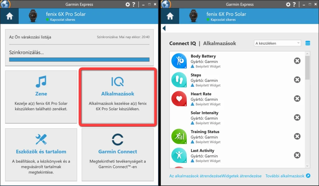 A másik opció a telefonodra (Android vagy iOS) telepíthető Connect IQ alkalmazás, amely kifejezetten ezen tartalmak kezeléséért felelős. Ugyanazokat a lehetőségeket éred el benne, mint a számítógép+Express verzióban. Fontos különbség, hogy míg a gépre USB-n csatlakoztatott óra esetében a telepítések és változtatások nagyjából azonnal megtörténnek, addig a Connect IQ telefonos alkalmazás – a Connecthes hasonlóan – egy ún. szinkronsorba helyezi a feltöltendőket, amik a következő szinkron alkalmával kerülnek át az órára. Ez – ha pl. egy összetettebb óraszámlapot telepítesz – a szokott szinkronnál hosszabb időt, akár 2-3 percet is igényelehet. Ha a Connect IQ alkalmazás magától nem indítja a szinkront, lépj át a Connectbe, és indítsd el onnan!