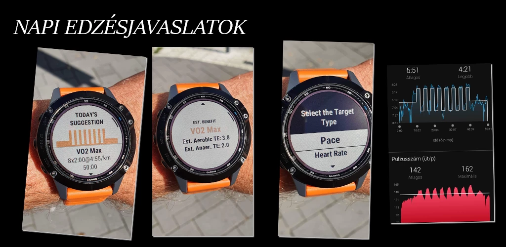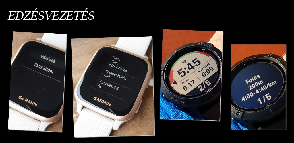 Az edzést az óra úgy vezényli le, hogy mindig az adott szakaszban fontos adatokat lásd, közben pedig hangjelzéssel figyelmeztet, ha elhagyod a megcélzott zónát. Az edzéseket tempóra, pulzusra, lépésszámra, bringánál wattra is megírhatod, többször ismételt ciklusokat iktathatsz be, a lehetőségek tehát tényleg nagyon szélesek.