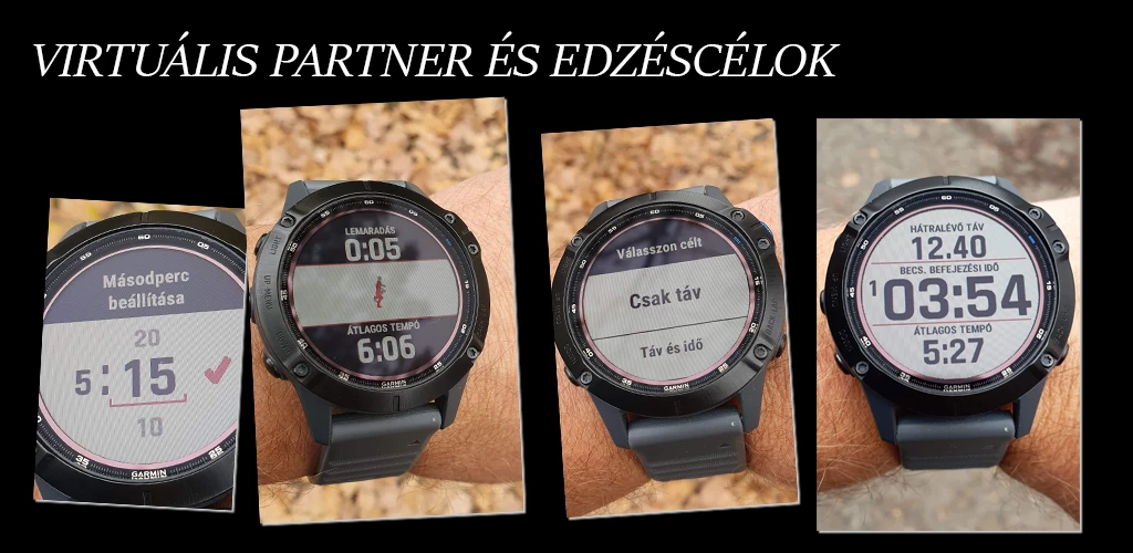 A másik esetben, mikor edzéscélt adsz meg, előre kitűzhetsz egy teljesítendő távot, vagy a távval együtt időt, esetleg tempót. Ilyenkor a szokott adatképernyőid mellé a célt mutató adatok képernyője is megjelenik. Hasznos szolgáltatás olyankor, ha pl. a versenytávot és az oda tervezett tempót szeretnéd gyakorolni, az óra mindkettőt folyamatosan követve mutatja, hogy állsz a tervhez képest.