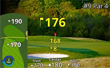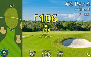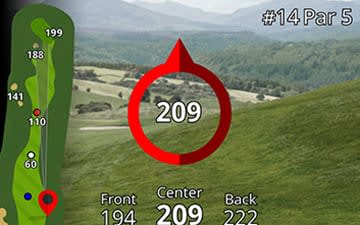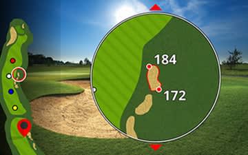 A térképrétegek megmutatják a lyuk elrendezését, így látod a távolságot a zöld elejéhez, közepéhez és hátuljához.