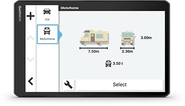 A Camper 1095 navigáció figyelembe veszi a lakóautód méretét és tömegét, majd ajánlott útvonalat keres1. Több jármű vagy lakókocsi profilját is elmentheted.