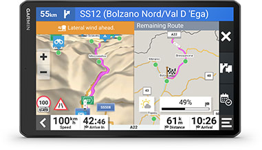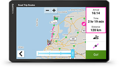 Lásd az egész hátralévő útvonal áttekintését az aktív útvonal mellett. Ha párosítod a Garmin Drive™ alkalmazással, előrejelzett időjárást is láthatsz.