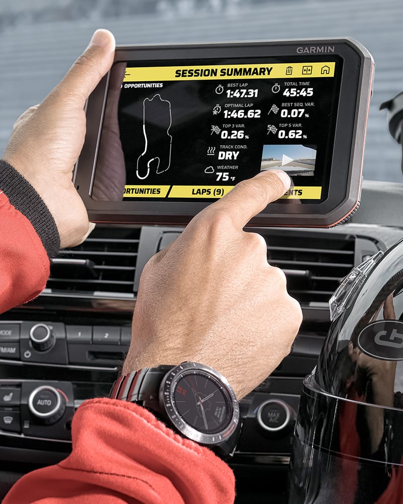 A pályán a Garmin Catalyst vezetési teljesítmény-optimalizáló nyomon követi a legjobb köridőt, az adaptív delta-időt, a körök számát és az összesített edzésidőt.