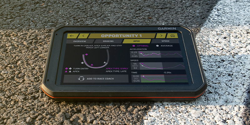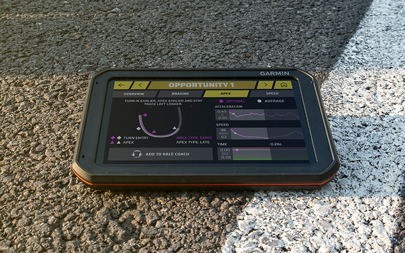 A pályán a Garmin Catalyst vezetési teljesítmény-optimalizáló gyorsan valós idejű edzővé válik, és Bluetooth® technológia révén ad hangos jelzéseket a headsethez2 vagy az autó sztereójához.