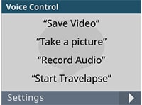 - Hangvezérlés(3) lehetővé teszi a hangfelvétel indítását/leállítását, fénykép készítését, illetve a Travelapse™ videofelvétel funkció indítását/leállítását
