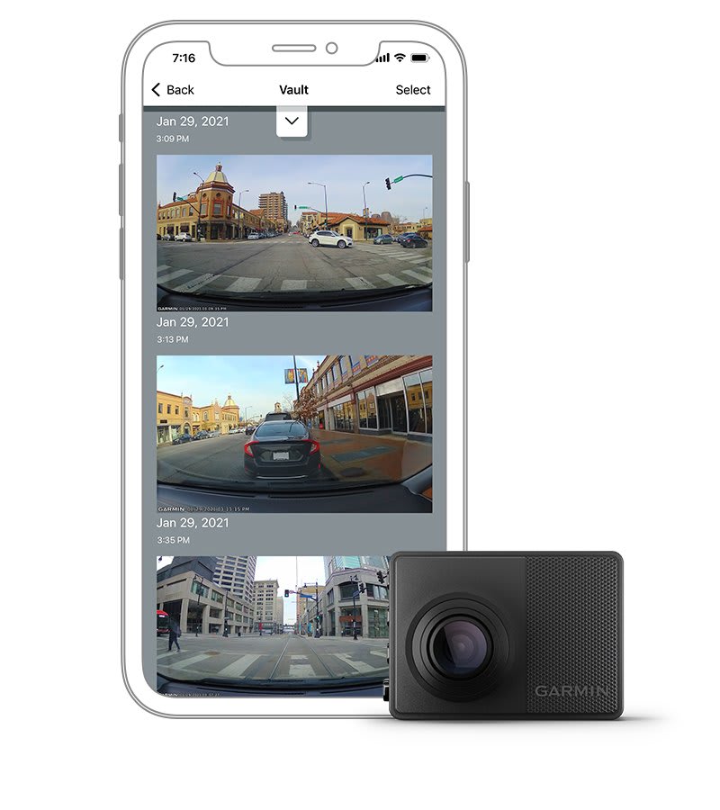 A Garmin Drive alkalmazás vezérelheti és lejátszhatja a szinkronizált videókat akár négy, jármű köré szerelt Garmin fedélzeti kameráról (külön megvásárolható), így több nézőpontból látható a felvétel.