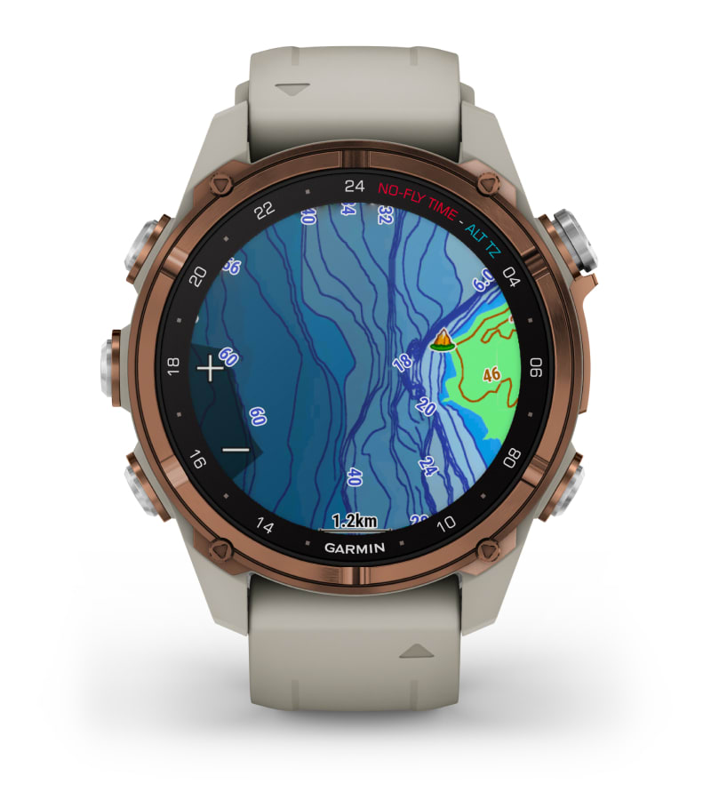A csuklódon megjelenő színes térképek bathymetrikus mélységi kontúrokat és több mint 4 000 merülőhelyet kínálnak, hogy új merülőhelyeket fedezhess fel és tájékozódj.