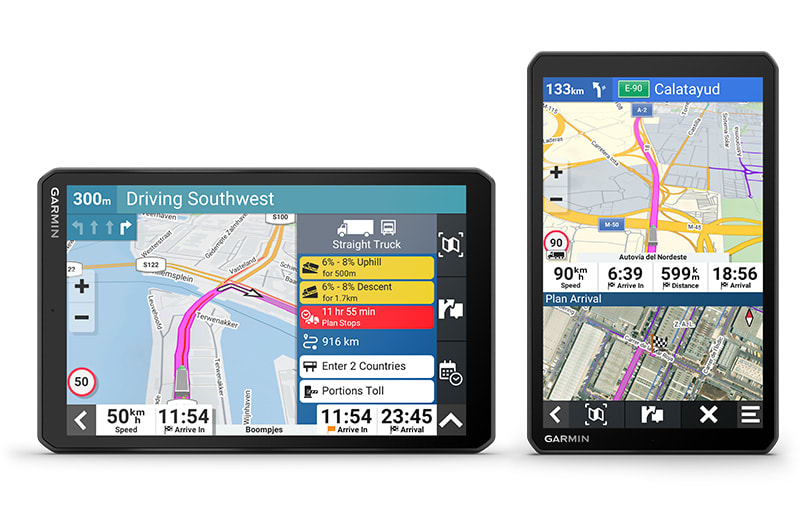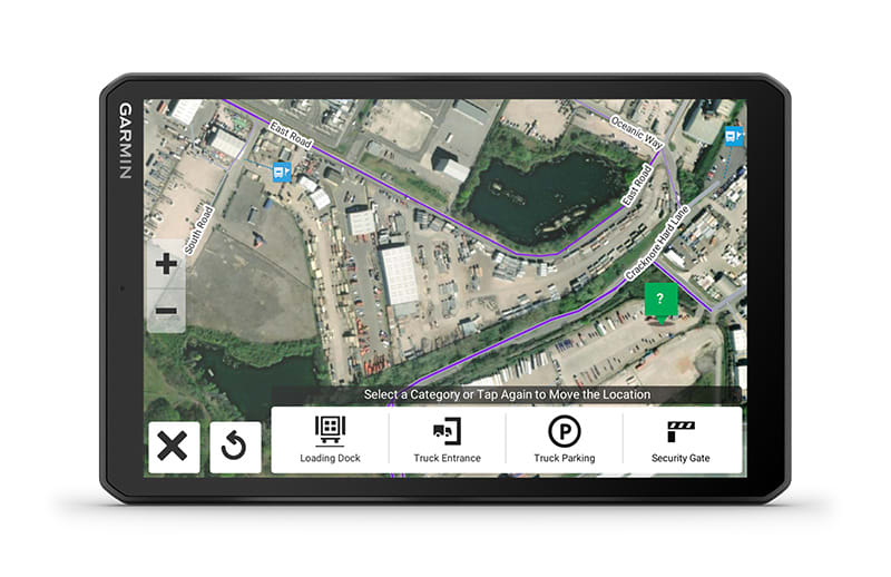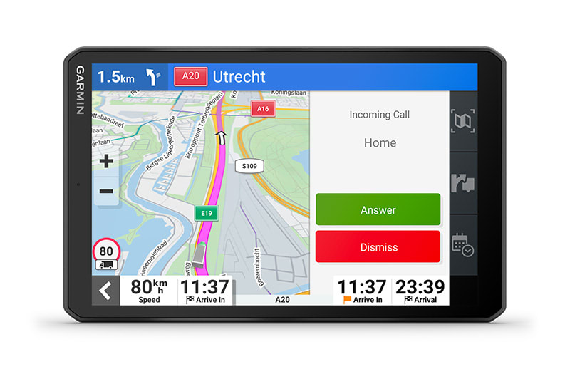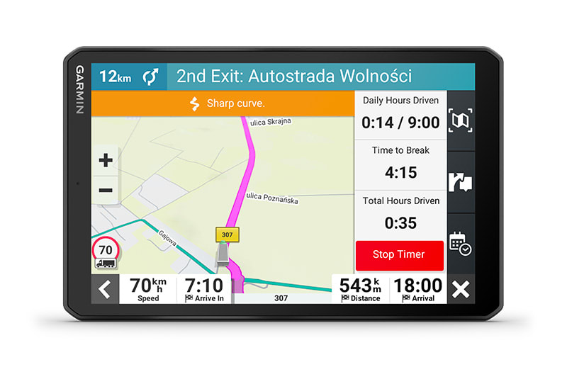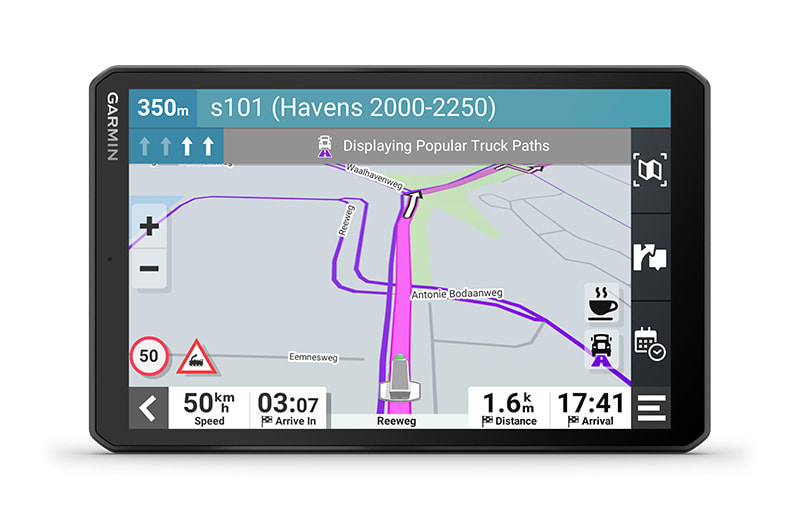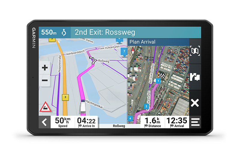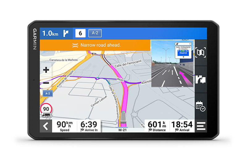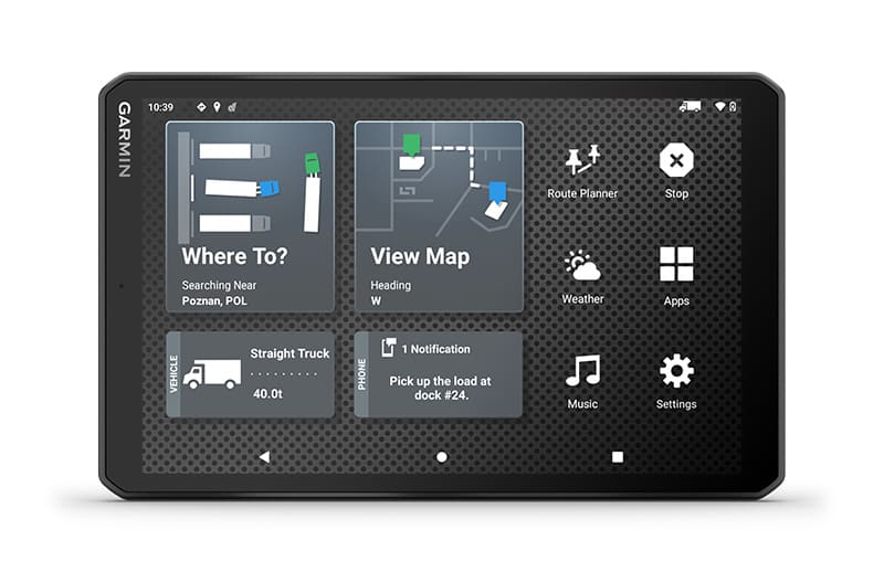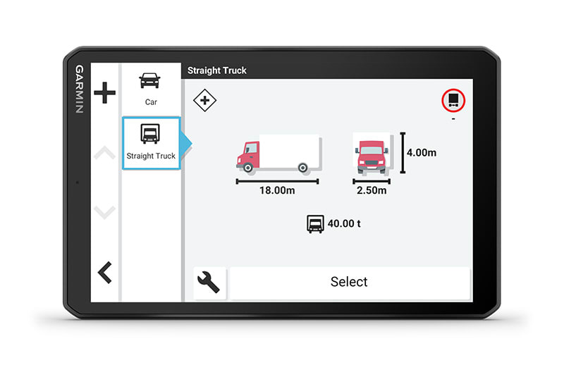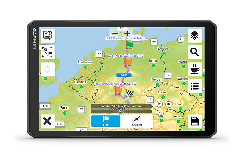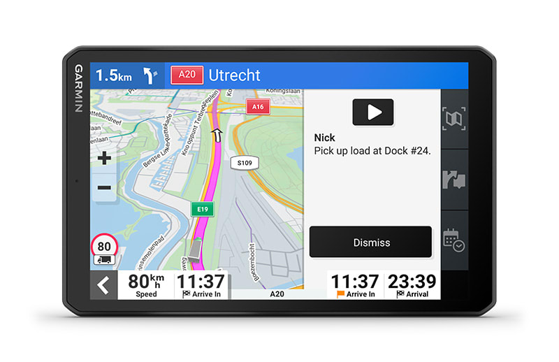 Ez a nagy, 8″-os tehergépkocsi-navigáció személyre szabott útvonaltervezést1 kínál a teherautó méretei és súlya alapján, stratégiai javaslatokkal üzemanyag-felvételre és pihenőkre, valamint korszerű érkezés-tervezéssel.