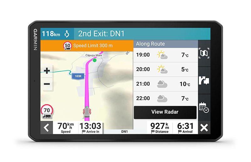 Könnyedén áttekintheti teljes útvonalát, és meghatározhatja a legjobb helyeket üzemanyag-felvételre, pihenőkre és éjszakai megállásra. Emellett az aktív térkép képernyőjéről előnézetet is kap a várható időjárási viszonyokról.