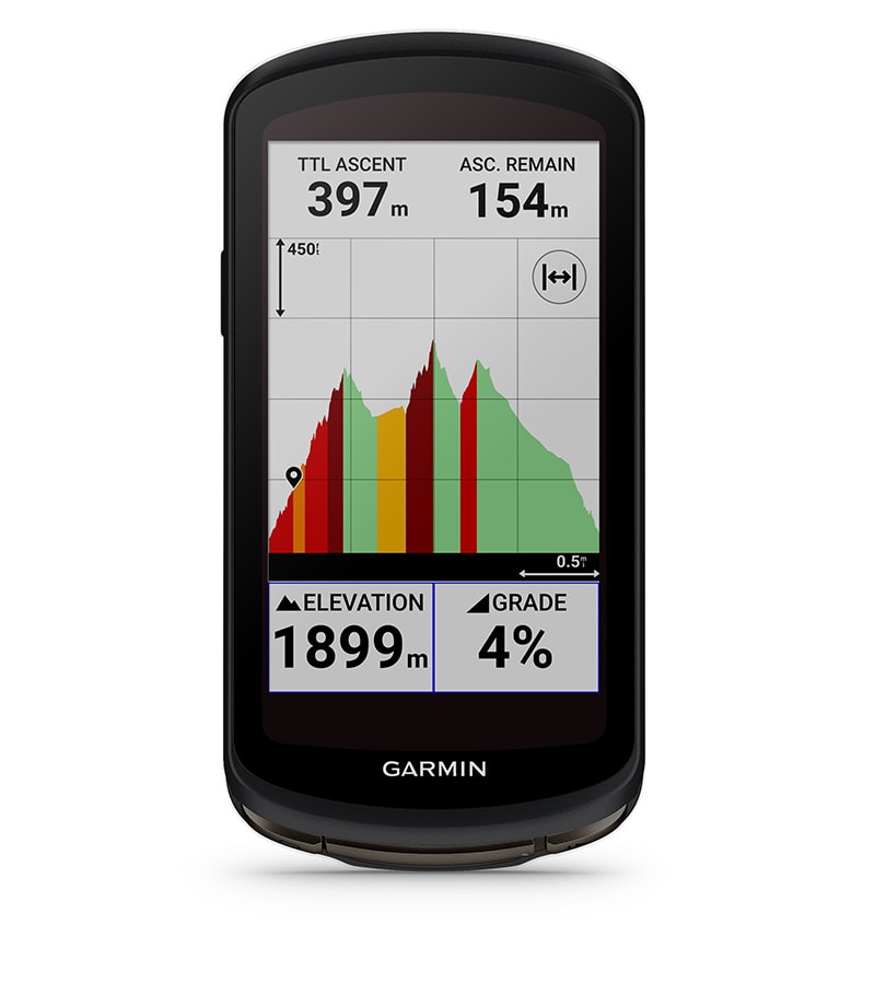 Automatikusan láthatod a hátralévő szintemelkedést és meredekséget, amikor emelkedsz egy útvonal vagy pálya követése közben. Ez segít felmérni az erőfeszítésedet és láthatod, mennyi van még hátra. Még el is mentheted az emelkedőket utólagos áttekintésre a kerékpáros számítógépeden vagy a Garmin Connect alkalmazásban.