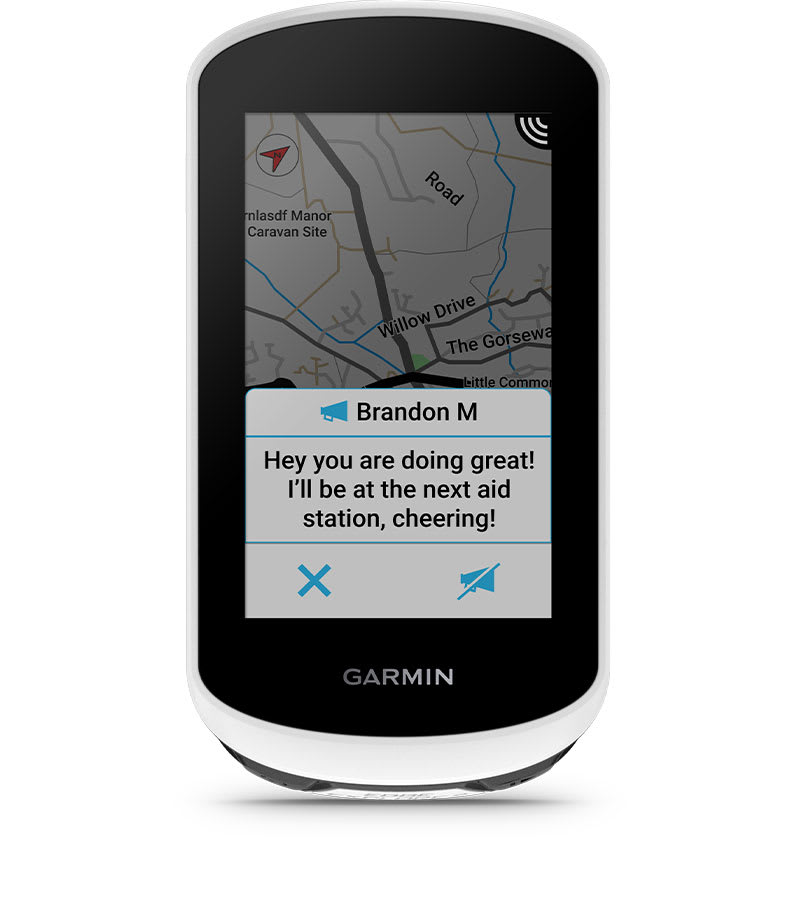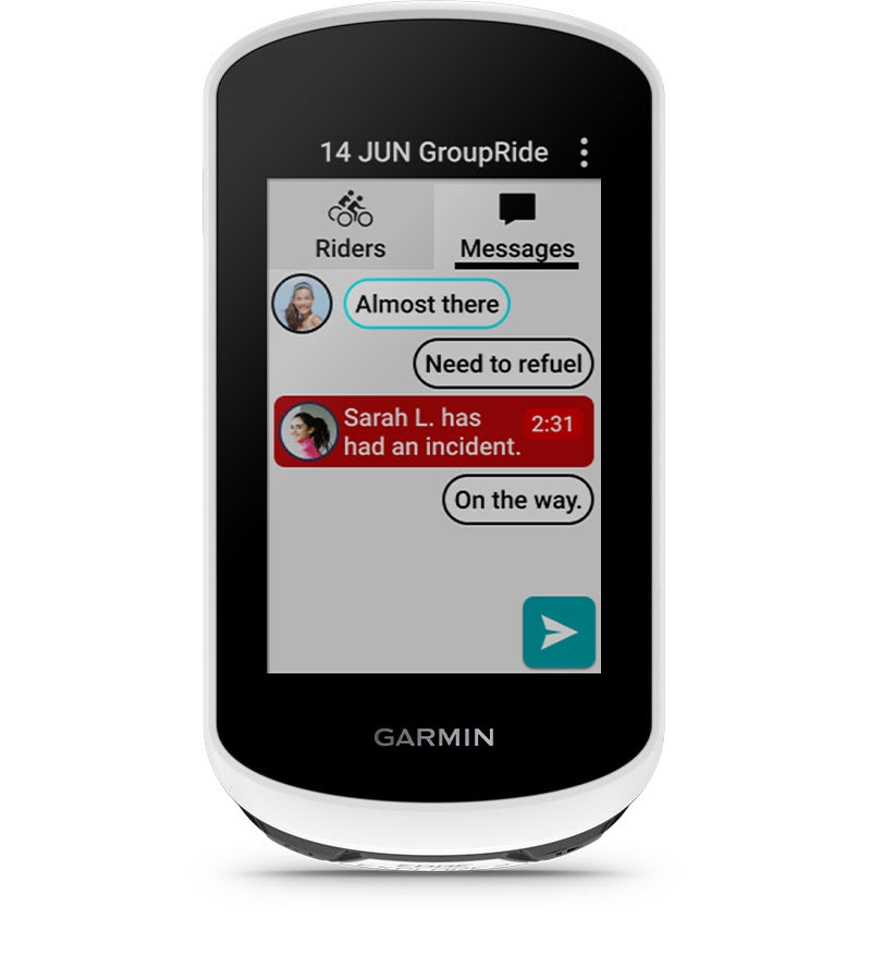 Párosítsd a telefonoddal, és tartsd a kapcsolatot a csapatoddal, ha elszakadsz a csoporttól. A csoportüzenet elérhető kompatibilis Garmin-eszközöket használó kerékpárosoknak, és csak azok a kerékpárosok kaphatnak üzenetet, akik rendelkeznek ilyen készülékkel.