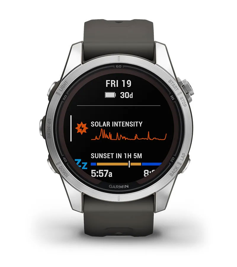 Akár 14 napot is kibírsz okosóra módban, ha naponta 3 órát közvetlen napfényben (50 000 lux) töltesz napelemes töltéssel, és akár 46 órát GPS módban napelemes töltéssel (feltételezve, hogy az egész időszak alatt folyamatosan 50 000 lux körül vannak a körülmények).