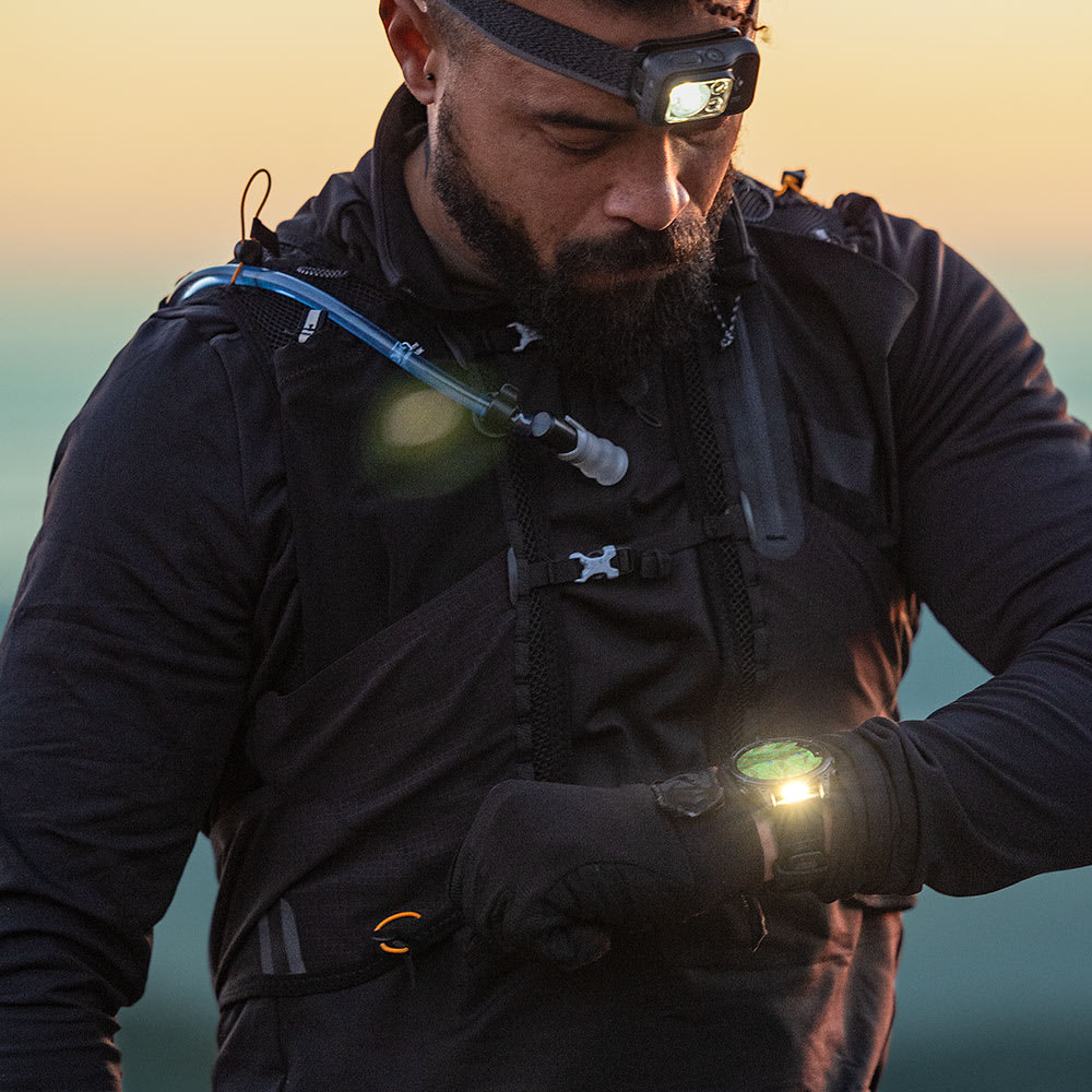 Valódi integrált zseblámpa változtatható fényerősséggel és vörös biztonsági fénnyel, amely nagyobb tájékozódást biztosít sötétben, és kényelmes megvilágítást nyújt, amikor szükséged van rá. A villogó mód még a futásod ritmusához is igazítható.