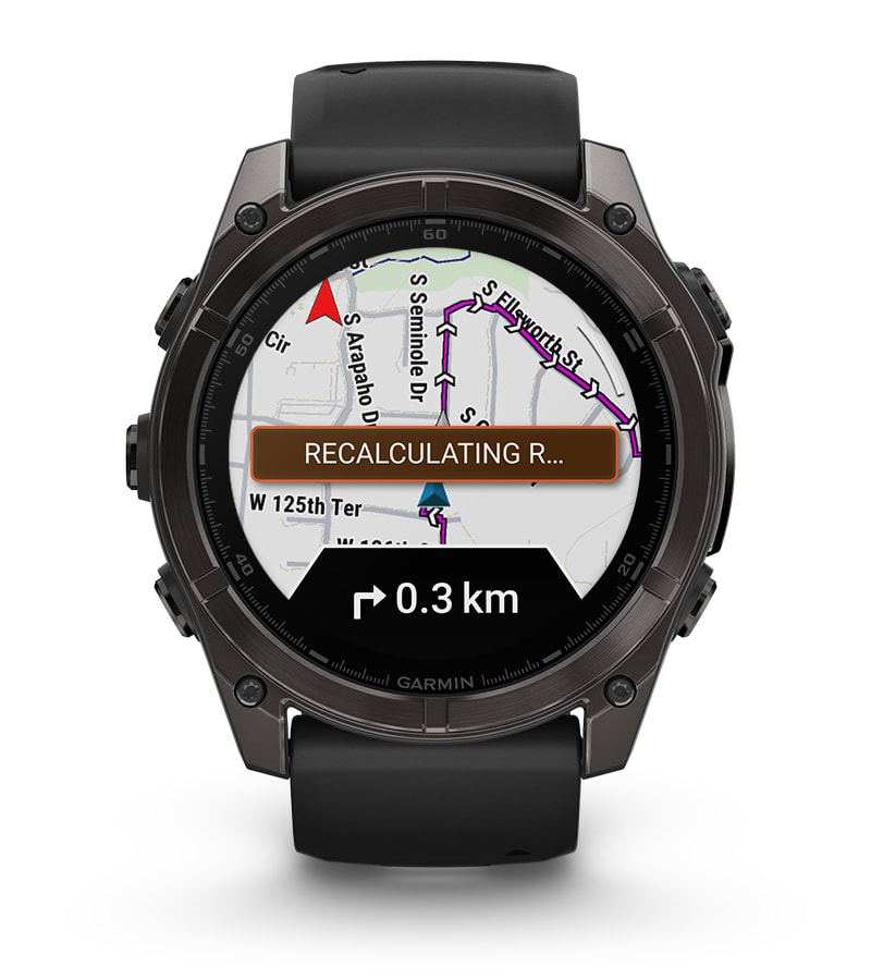 A dinamikus oda-vissza útvonal-funkció lehetővé teszi, hogy megadd, milyen távolságot szeretnél megtenni — és javasolt útvonalakat kapj, amelyek időben visszavezetnek. Megtekintheted a terep szintvonalait a TopoActive térképeken3, és hozzáférhetsz előre betöltött térképekhez golfpályákhoz és síterepekhez a világ minden táján.