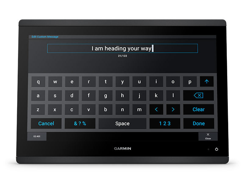 Párosítsa inReach műholdas kommunikátorát4 a térképező egységével, és írjon egyéni üzeneteket az MFD képernyőjén megjelenő billentyűzettel. Hozzáférhet névjegyzékéhez vagy beírhat egy e-mail címet, inReach címet vagy telefonszámot. Üzeneteket csoportosíthat beszélgetések szerint is, így üzenetküldéshez hasonló élményt kap.