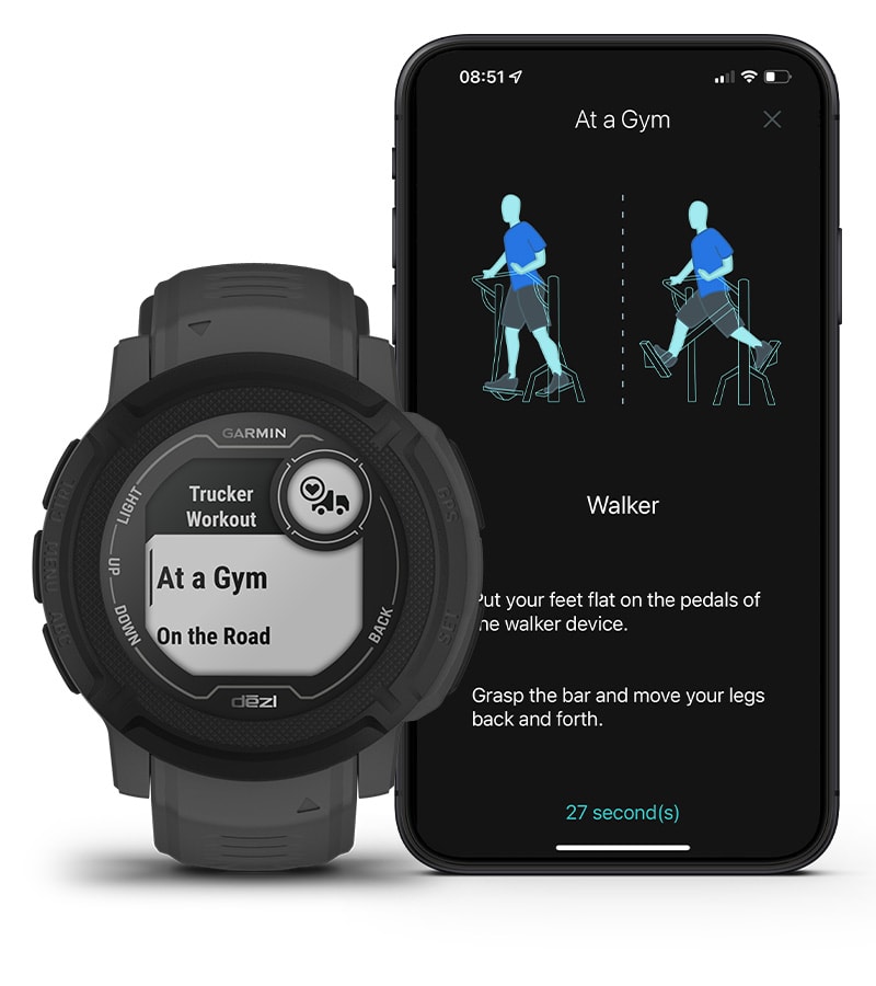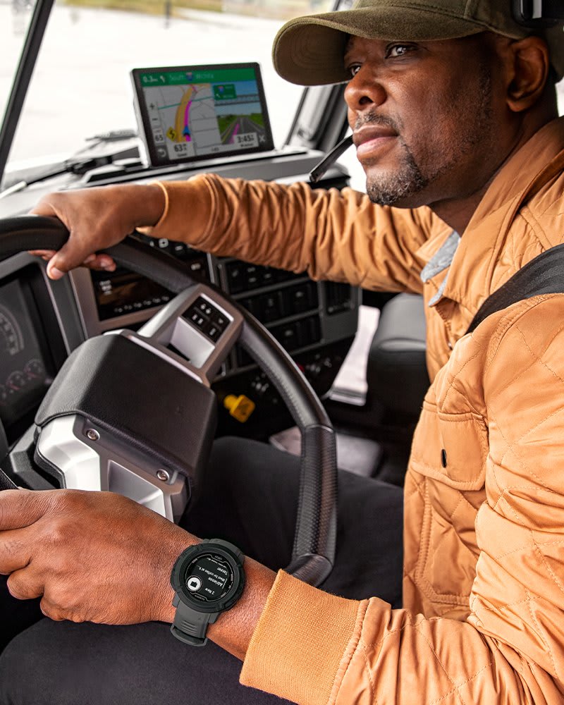 Párosítsd a multisport órádat egy dēzl LGV sorozatú teherautó navigációval a szünettervező időzítők szinkronizálásához, és hogy a nagy navigációs képernyőn valamint a csuklódon megjelenő órán is lásd az egészségügyi mutatókat és jólléti javaslatokat.
