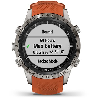 A beépített, újratölthető lítiumakkumulátor akár 12 nap üzemidőt biztosít okosóra módban, 28 órát GPS módban, 48 órát UltraTrac™ módban és 9 órát GPS módban zenével.