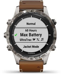 A beépített, tölthető lítium akkumulátor akár 12 nap üzemidőt biztosít okosóra módban, 28 órát GPS módban, 48 órát UltraTrac™ módban és 9 órát GPS módban zenével.