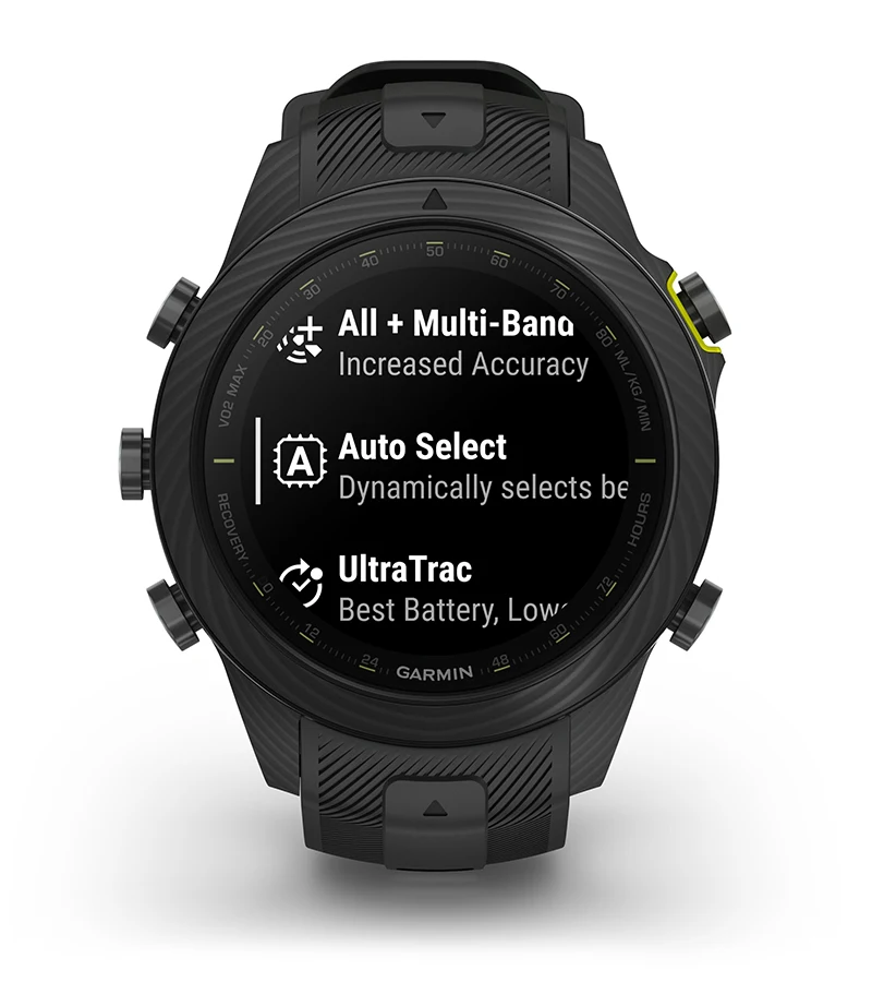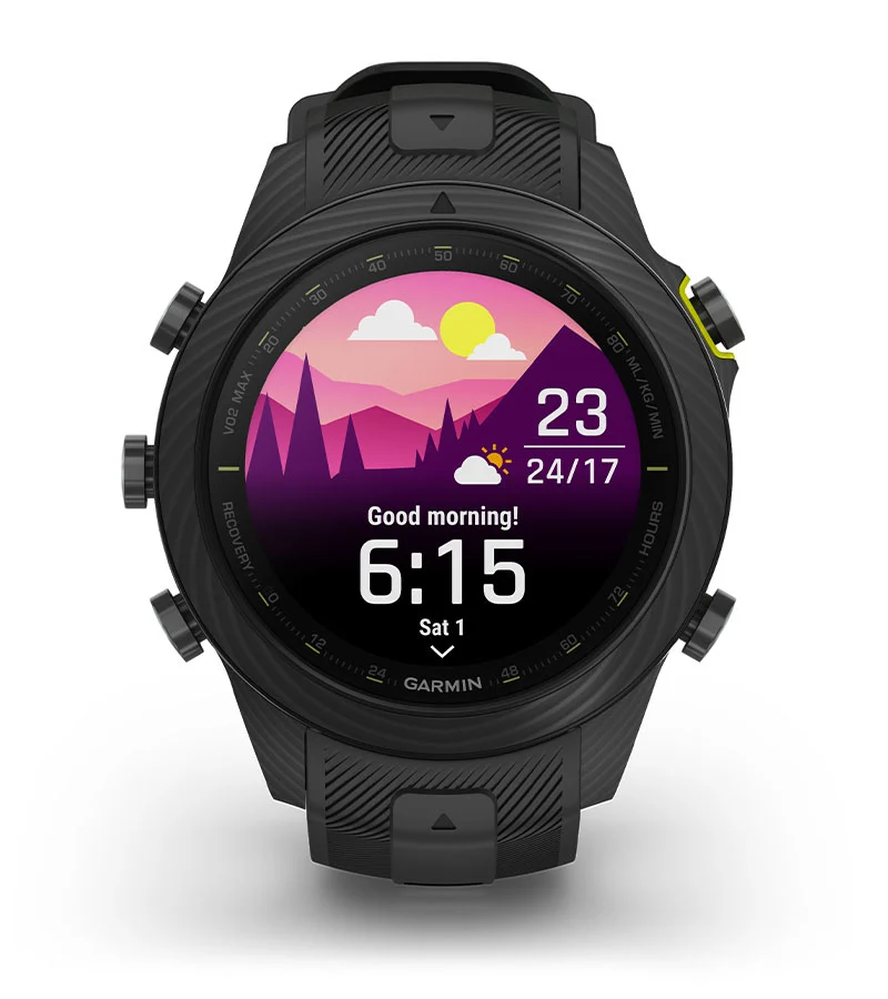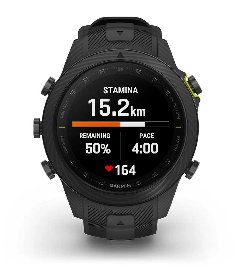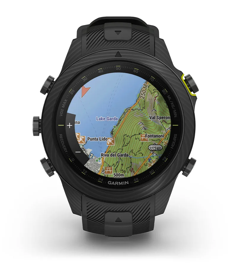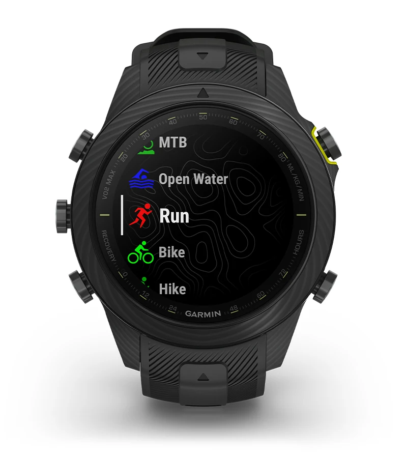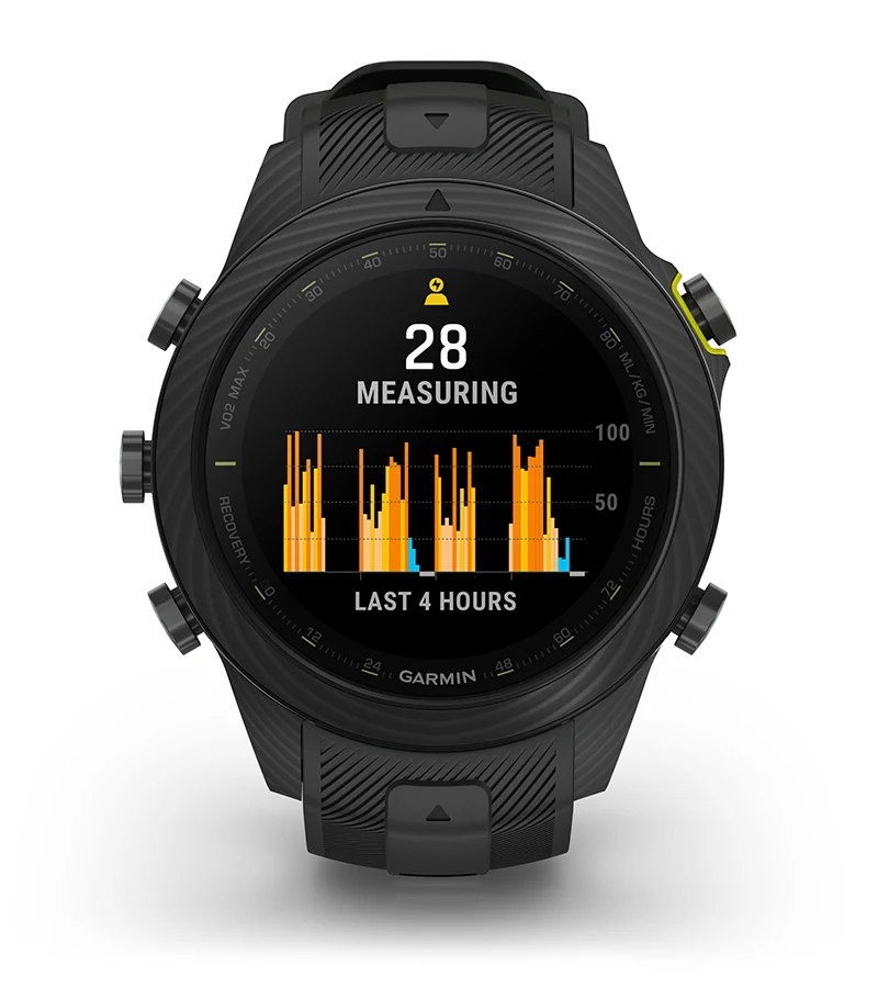 A legkeményebb versenyzők számára készült, ez a modern eszközóra lenyűgöző AMOLED érintőkijelzővel és hagyományos gombvezérléssel rendelkezik. A 46mm tok és a lünetta betét összeolvasztott szénszálas anyagból készült, rendkívül tartós, teljesítményorientált kialakítást biztosítva.
