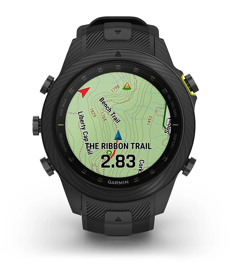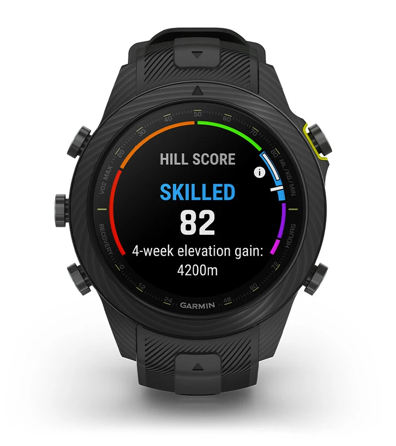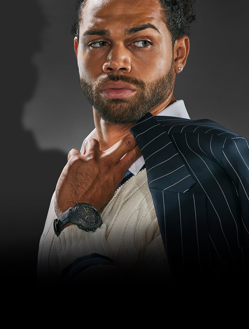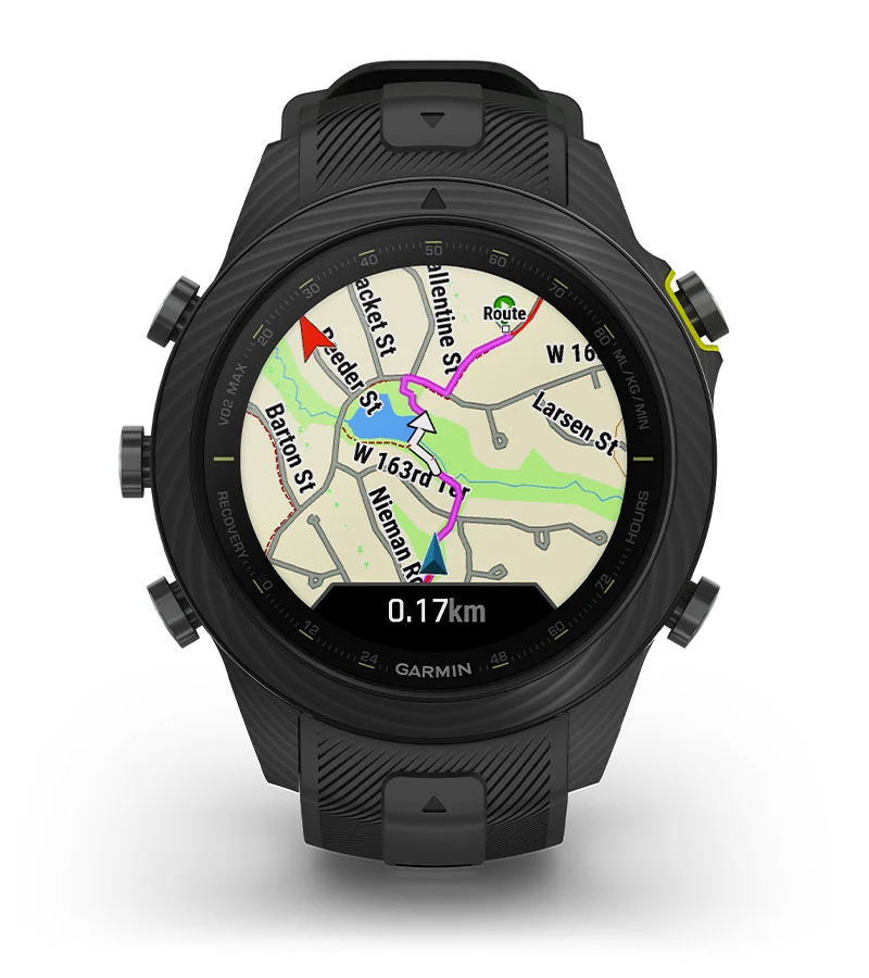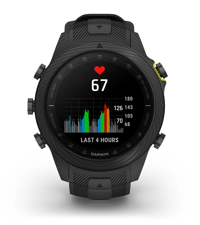 A legkeményebb versenyzők számára készült, ez a modern eszközóra lenyűgöző AMOLED érintőkijelzővel és hagyományos gombvezérléssel rendelkezik. A 46mm tok és a lünetta betét összeolvasztott szénszálas anyagból készült, rendkívül tartós, teljesítményorientált kialakítást biztosítva.