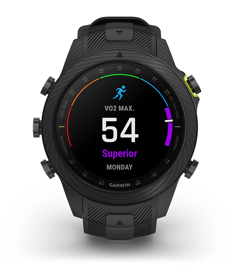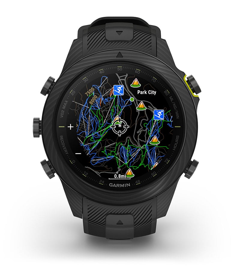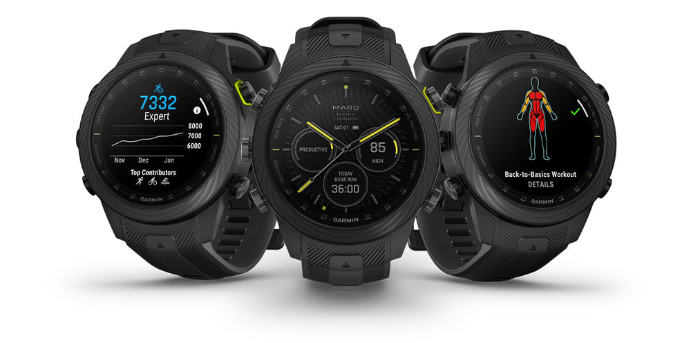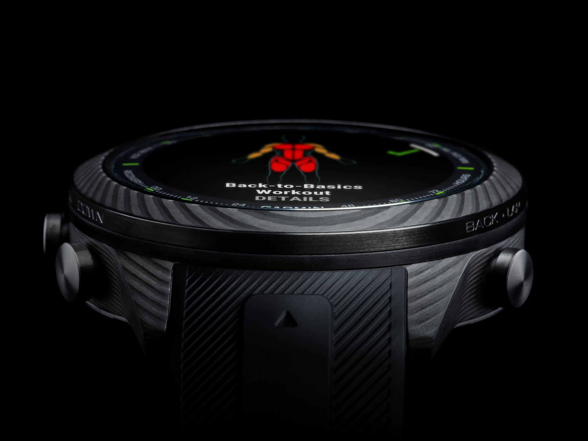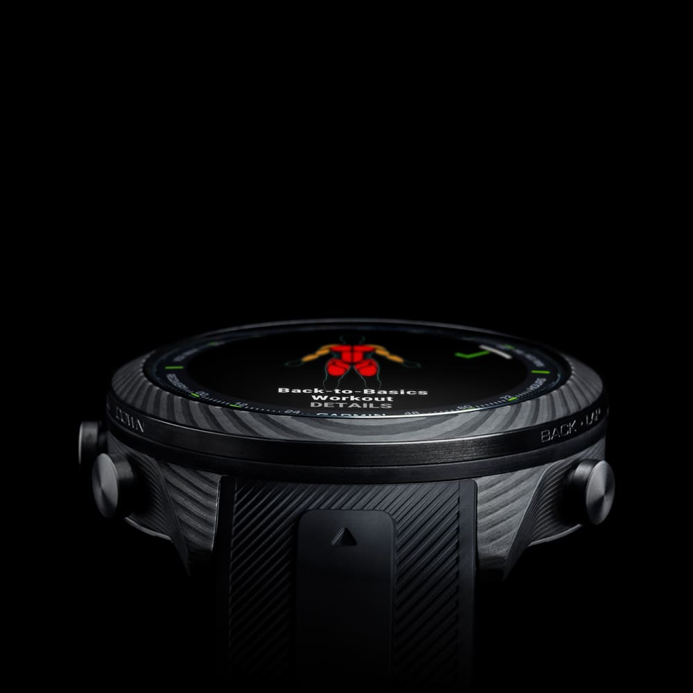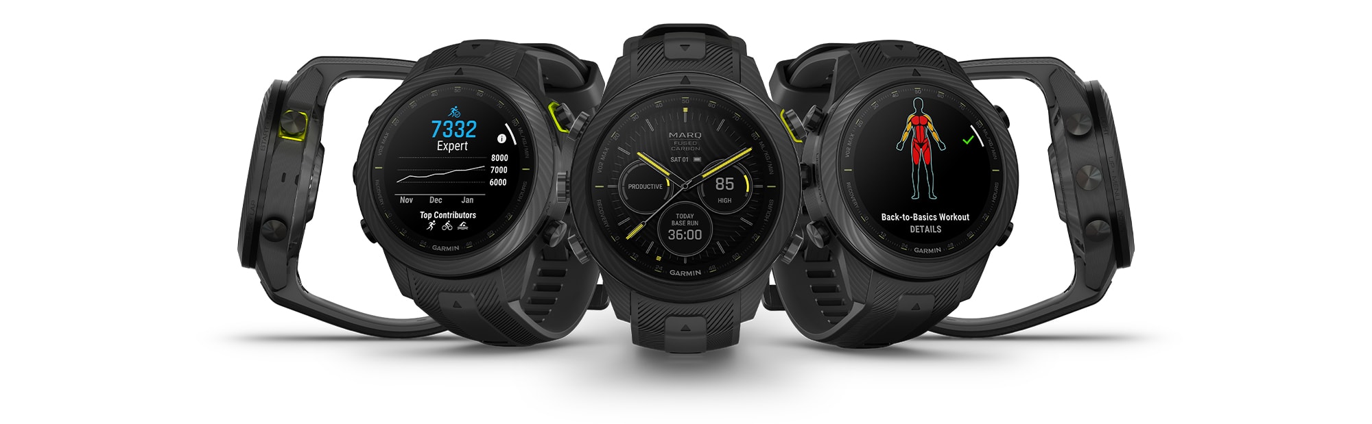 MARQ Athlete – Carbon egy modern eszközóra, amely Fused Carbon Fiber™ anyagból készült, és élénk AMOLED kijelzővel, érzékeny érintőképernyővel, valamint V02 max kerámiajelzésekkel rendelkezik.