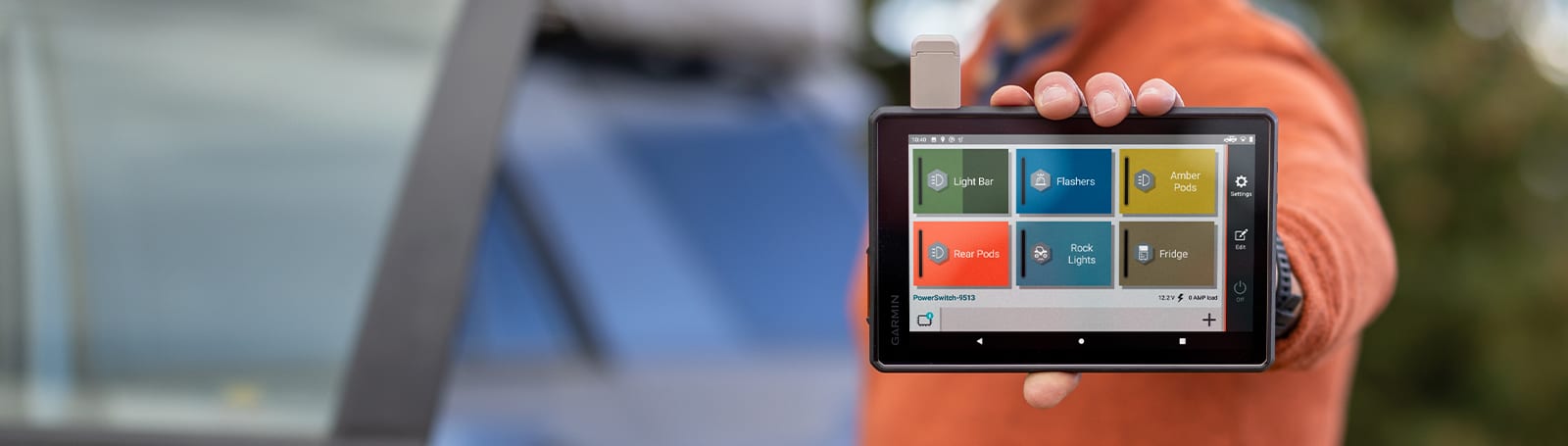 Párosítsd a Tread motorsport navigációt a kompatibilis Garmin PowerSwitch™ digitális kapcsolódobozzal (külön vásárolható), hogy lehetővé tedd a jármű 12 voltos elektromos rendszereinek — fénysávok, differenciálzárak és más eszközök — képernyőről történő vezérlését.