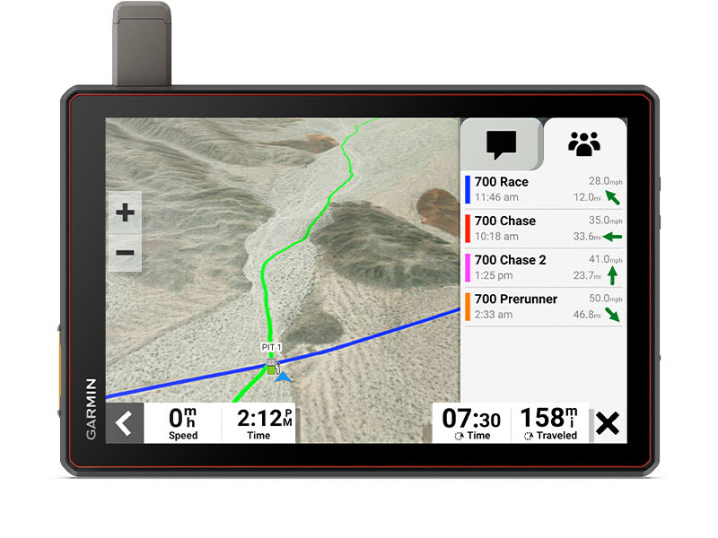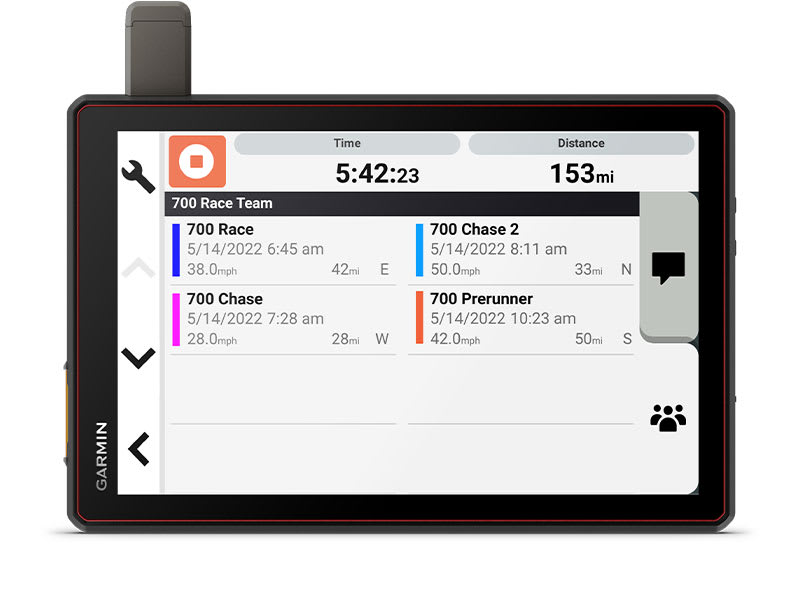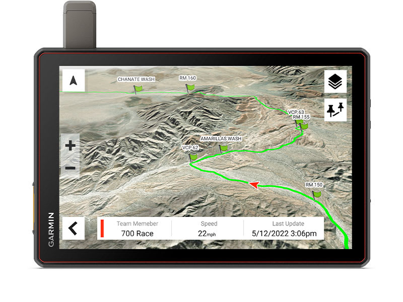 A csapatkövetés beépített inReach® technológiával lehetővé teszi, hogy a versenyjárművek és a kísérő teherautók üzeneteket küldjenek egymásnak és valós idejű pozíciófrissítésekkel kövessék egymást1.