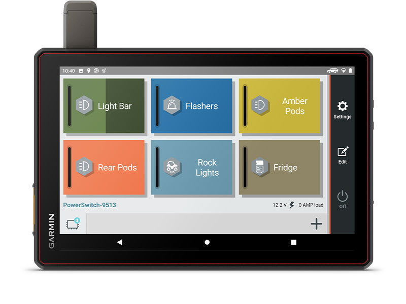 A Tread XL terepre tervezett versenynavigáció kompatibilis a Garmin PowerSwitch™ digitális kapcsolódobozzal (külön megvásárolható), amely segítségével vezérelheted járműved 12 voltos kiegészítőit, például az alvázvilágítást, ventilátorokat és levegőpumpákat.